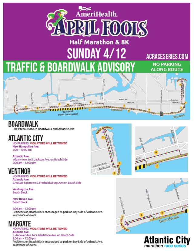 The AmeriHealth April Fools Half Marathon and 8K will be held this Sunday, April 12, and will affect parking along:- Atlantic Avenue- Washington Avenue - New Haven Avenue See details below and visit acraceseries.com for details.